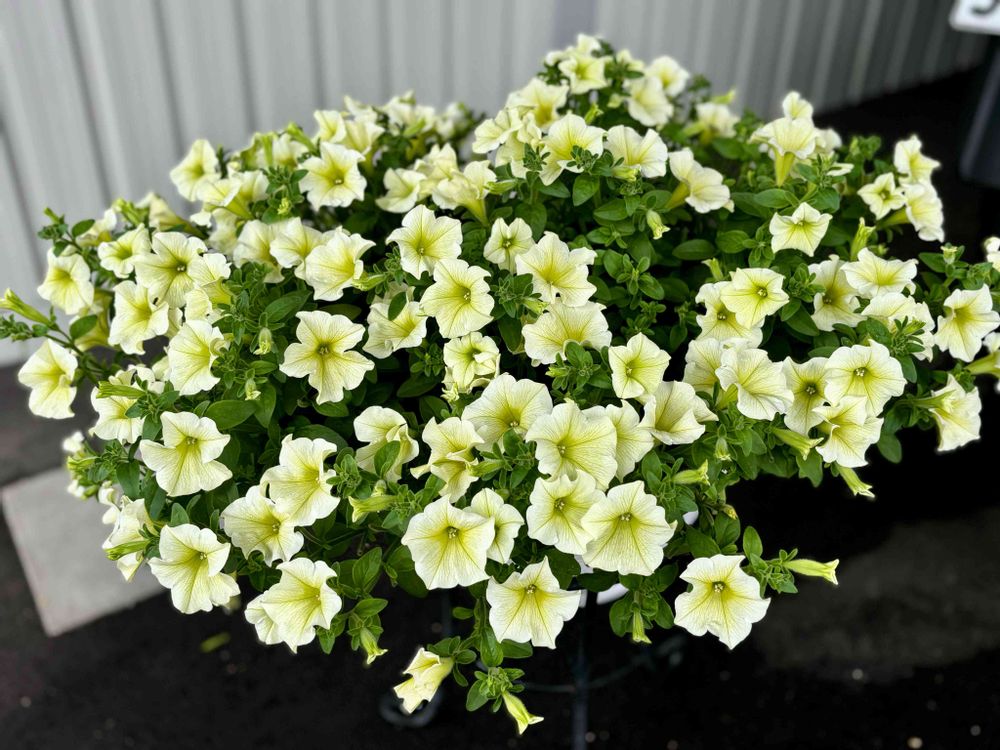 我が愛するサフィニアちゃん🌼雨宿り中です。もう暴れ出したのでそろそろ切り戻さないといけないのはわかってるんですが、先週カリブラコア軍団を切り戻したのでペチュニア軍団は来週な!