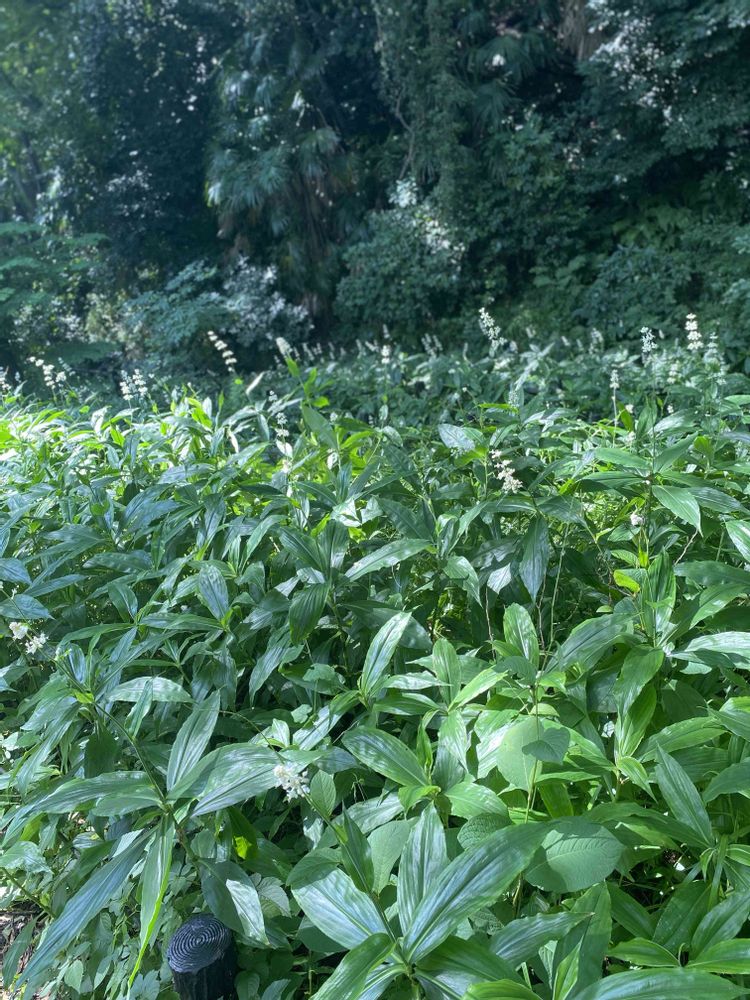山野草かと思いますが、はたして食べられるかは…いつも食べている茗荷とはお花も全く違ってこの後綺麗な🟣紫色の真珠のような実ができます。