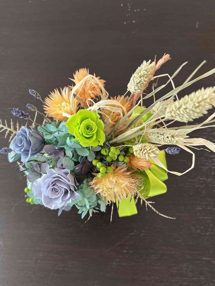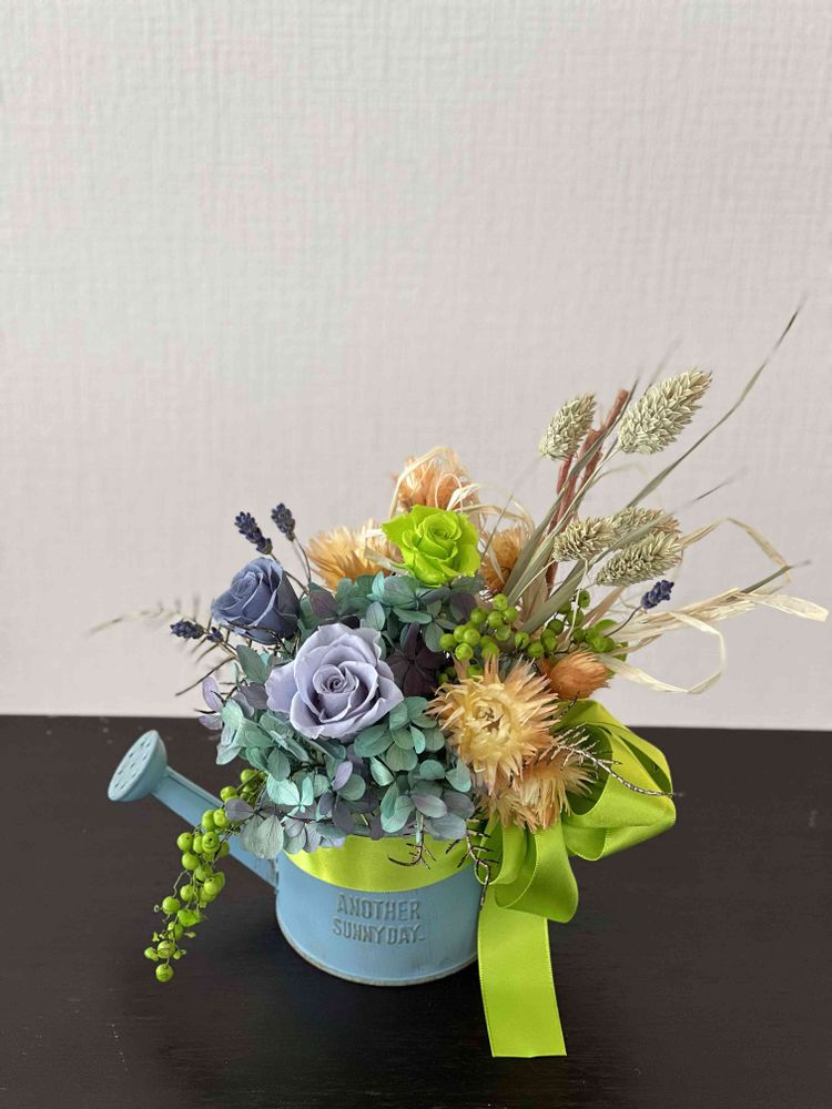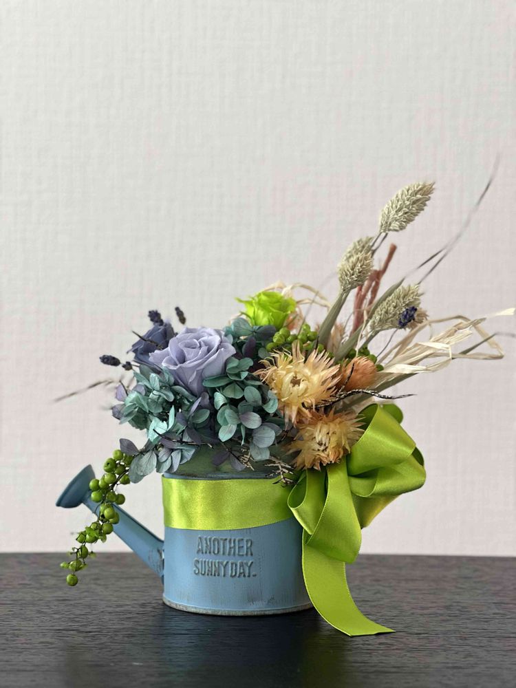 花材🌷ブリキジョウロ、プリバラ、セラミッドアジサイ、ペッパーベリー、ボアプランツ、シルバーデイジー、シダバンドル、ラフィア、リボン他