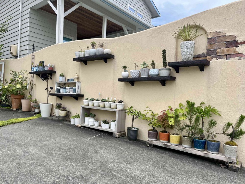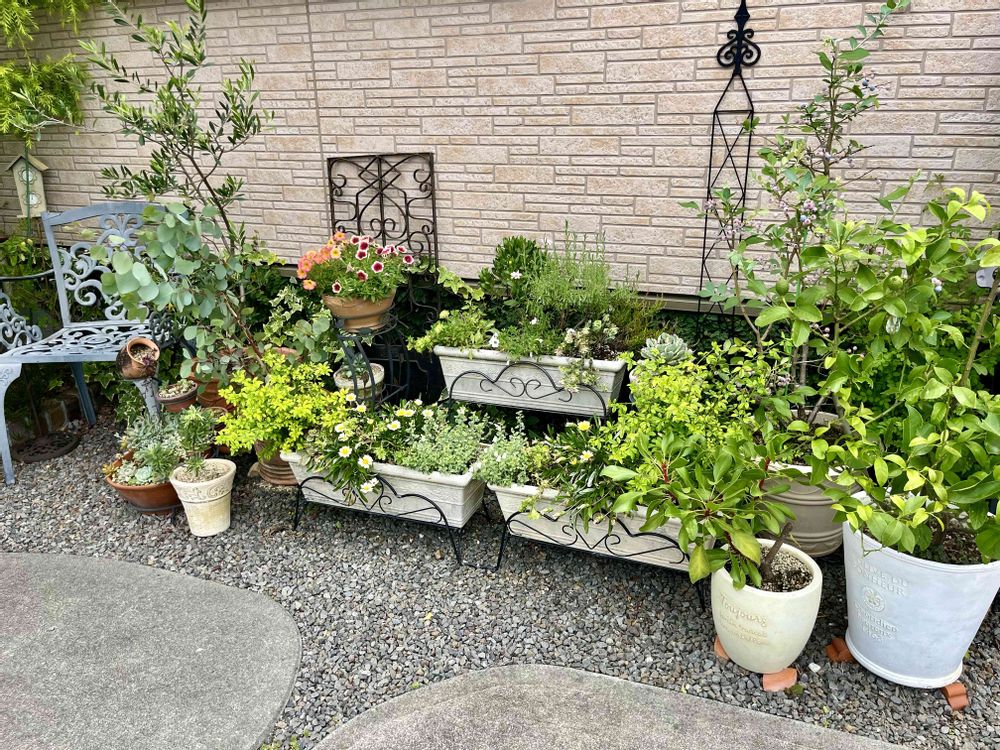 駐車場、駐輪場、ウッドデッキにスペースとられちゃってるので、家の建物沿いやフェンス沿いに置けるだけで、広い植栽スペースはないんです🥲