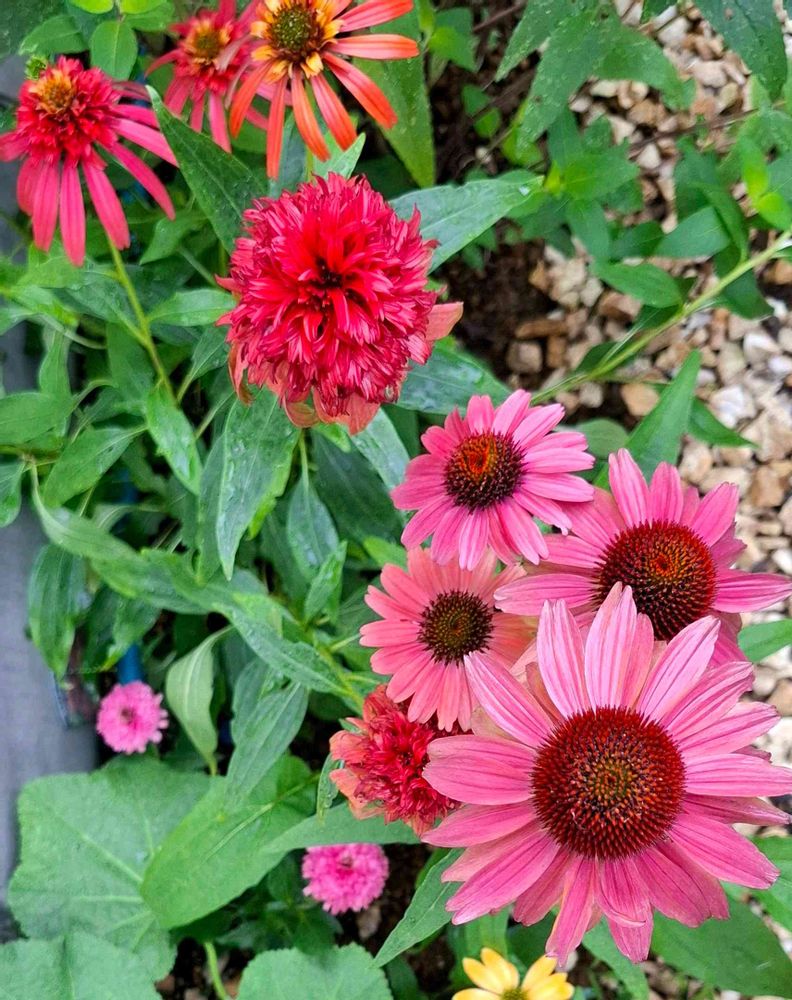 西日がカンカンにあたるところに植えたエキナセアたち。硬いイガイガをなでなですると元気がもらえます。