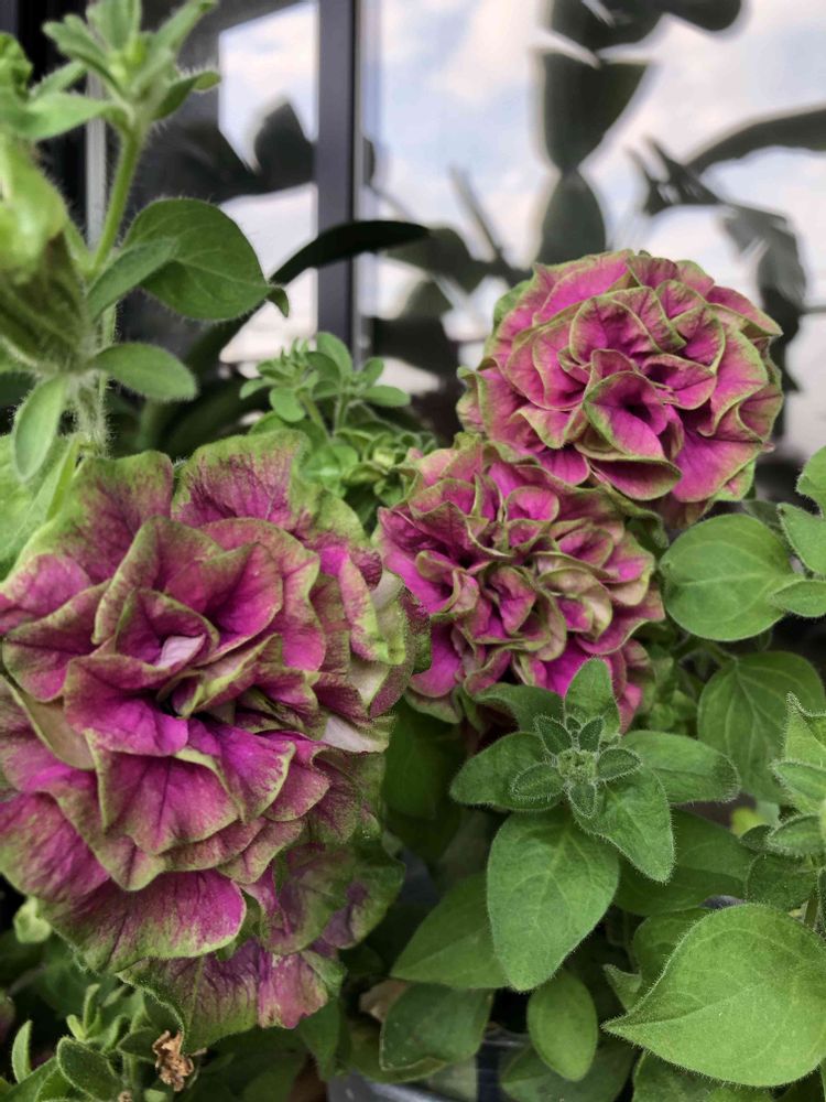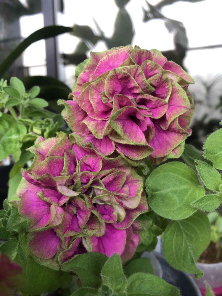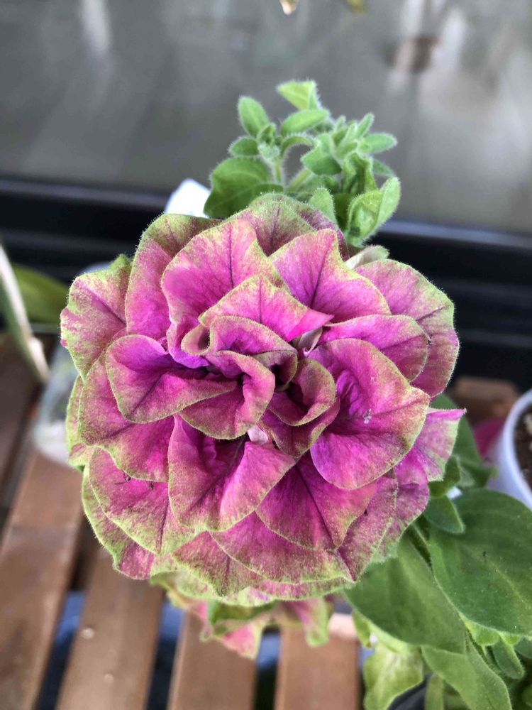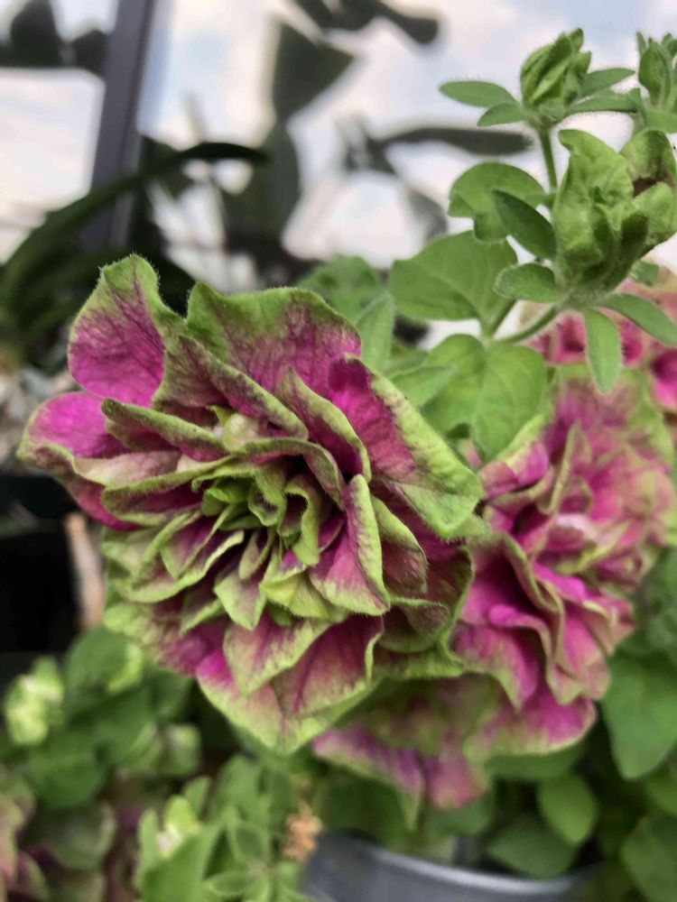 ピンクとグリーンの豪華な八重咲きペチュニアです。