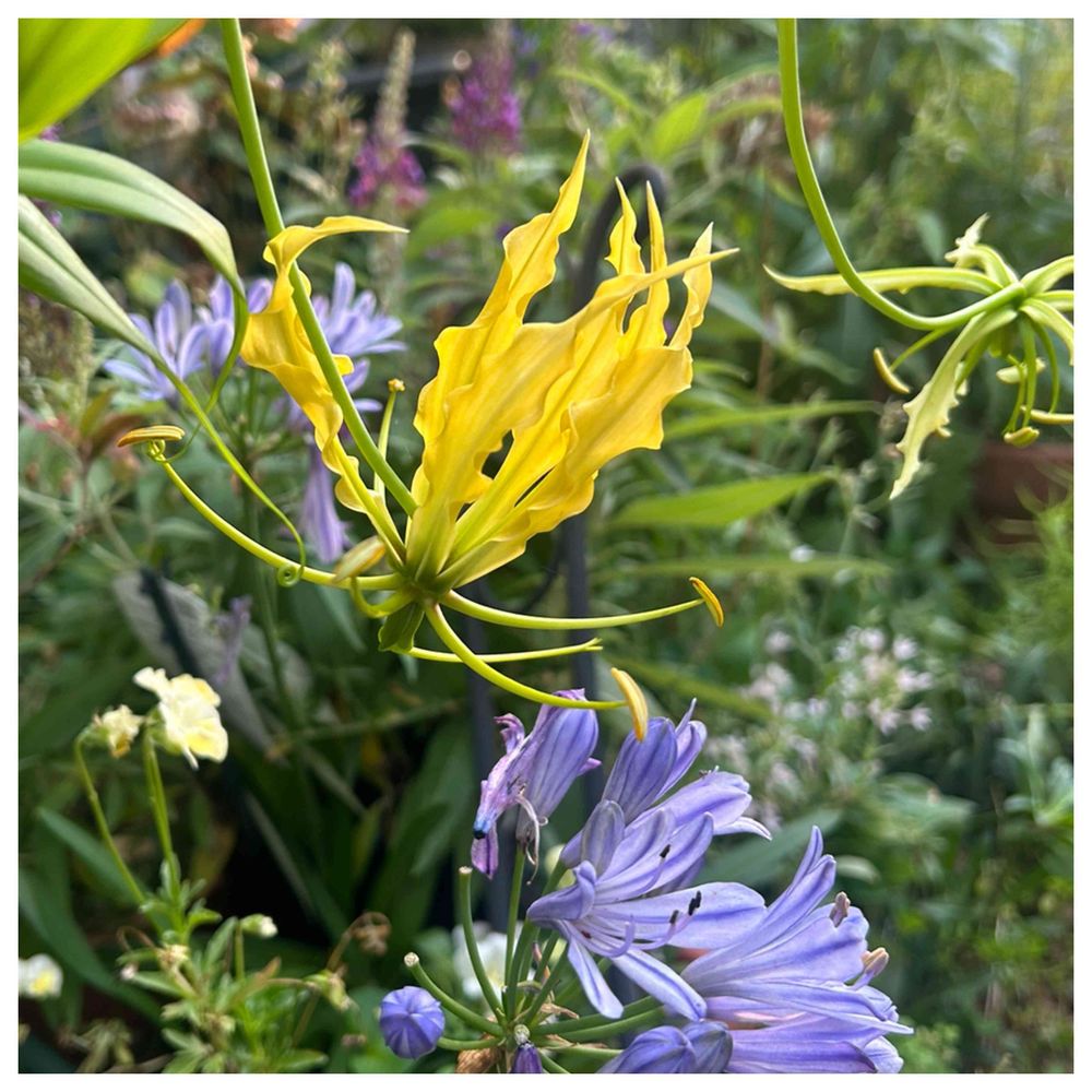 昨夏よく咲いたグロリオーサ ルテア。球根を掘り上げるのを忘れたけど 無事に芽が出て花が咲きました。アガパンサスも咲いてます。