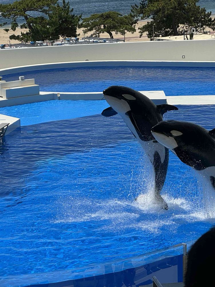 オルカスタディアムで賢いオルカのショーを見ました。前列で水しぶきで💦💦💦びしょ濡れになる勇気はありませんでした😆