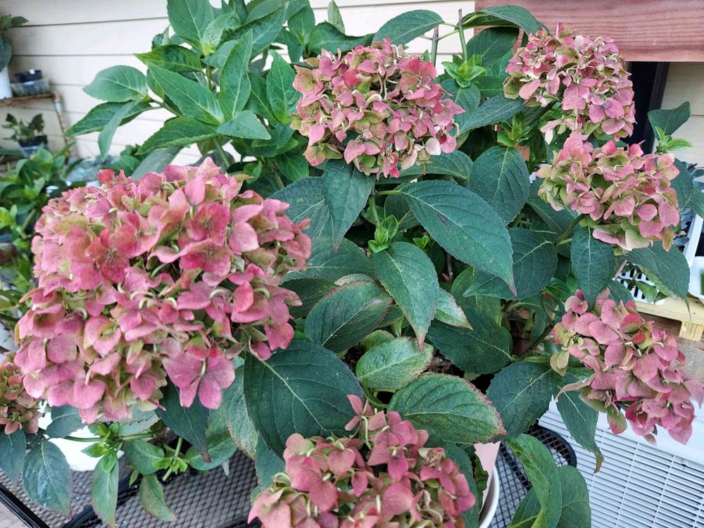 ①紫陽花の白寿紅 ほとんどが白から赤くなる途中で茶色くなってしまいました。今年はこれが限界です。
