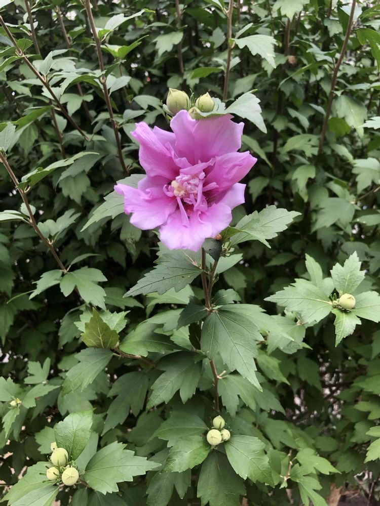 道路沿いの草村にて、半八重咲きの「ムクゲ」をパチリ!📸💜🌿😊