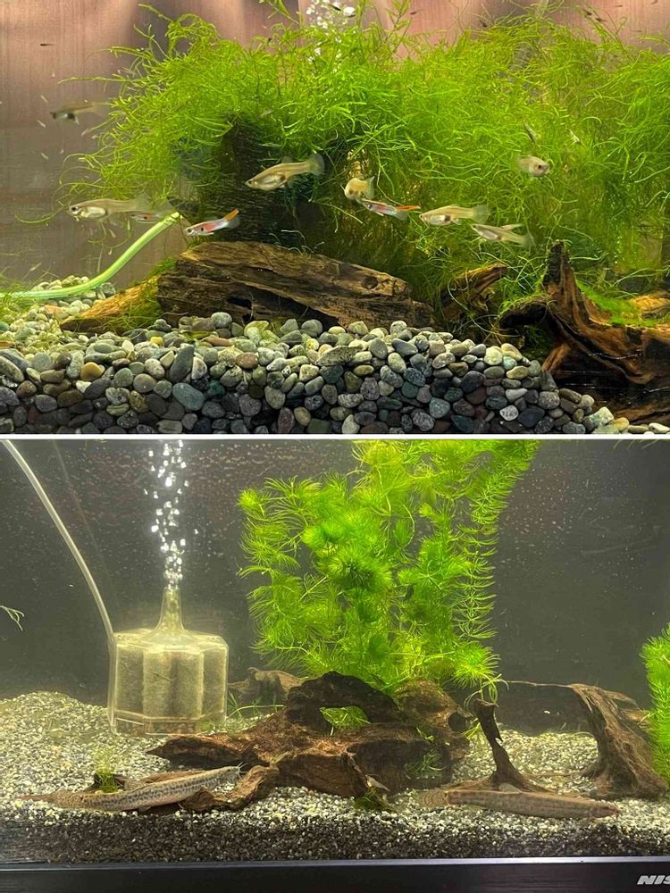 ➌ 下がおととい!上がきのうの作業です!特に下は砂利までゴシゴシの総取っ換えは仕立てて以来初めての約30年ぶりくらいでした👏 上の方は多分9年くらいだと思いますが、何せ赤ちゃんのグッピーとエビが多いので、大半を引っ越しの時間に割かねばならなかったのが凄い手間になりましたー🥵☹️
