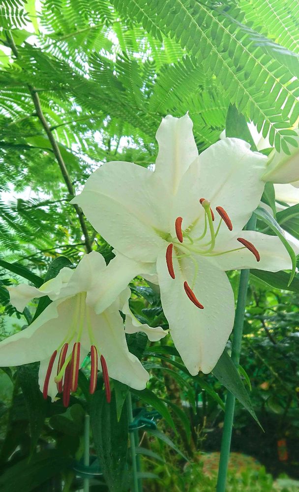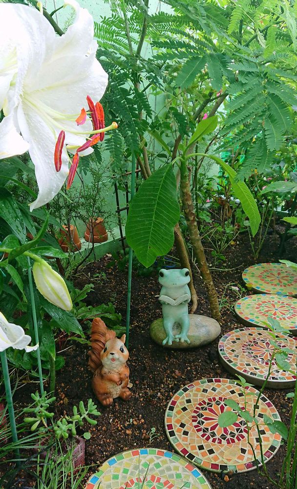 my garden🌼白く可憐なカサブランカさんが咲きましたヽ(´▽`)/💓♥️❤️リス🐿️ちゃんがじっと見つめています🤣(笑)去年、優しい花友さんから譲り受けましたネムノキさんが、想像以上に暴れ育ち、パラソル⛱️になっていて、やっと芽吹いたプルメリアさんをガンガンの西日から守ってくれています💕😁💕(笑)カエル🐸さんも涼みながら読書中です🎵