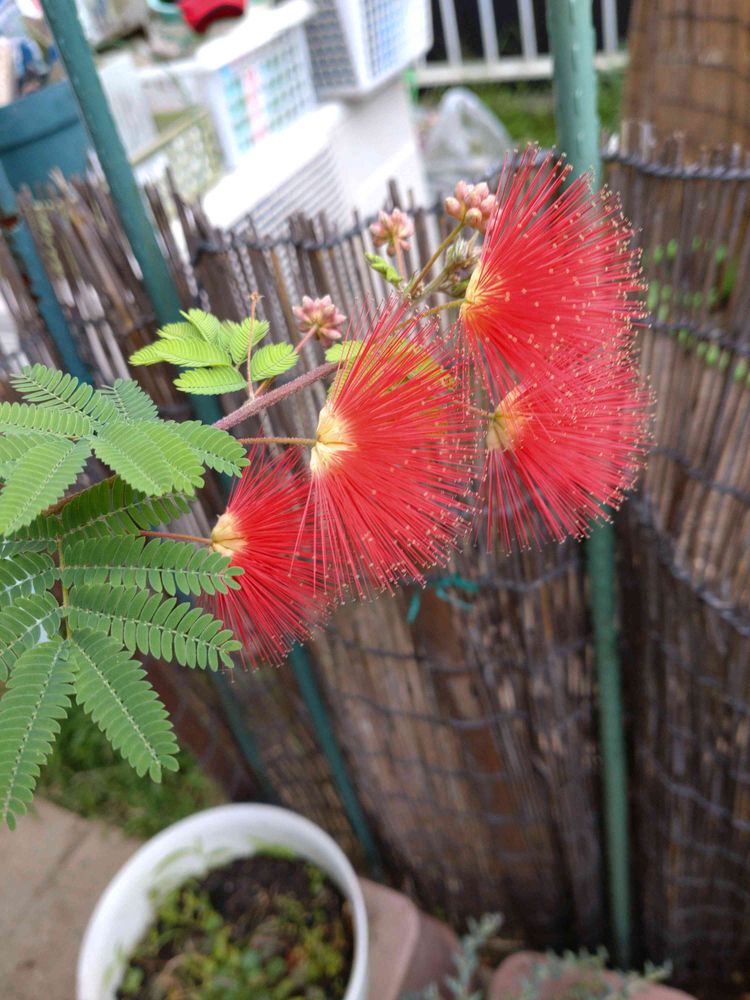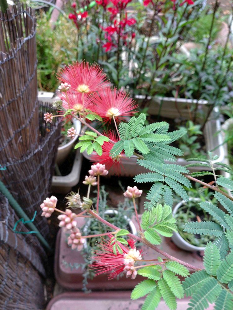 向こうのすだれは、エアコンの室外機の風から、花を守るものです。