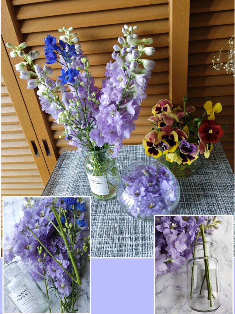 デルフィニウムの爽やかなブルー系とパンジーの明るい暖色系、どちらも素敵に飾られてますね〜♡♡♡