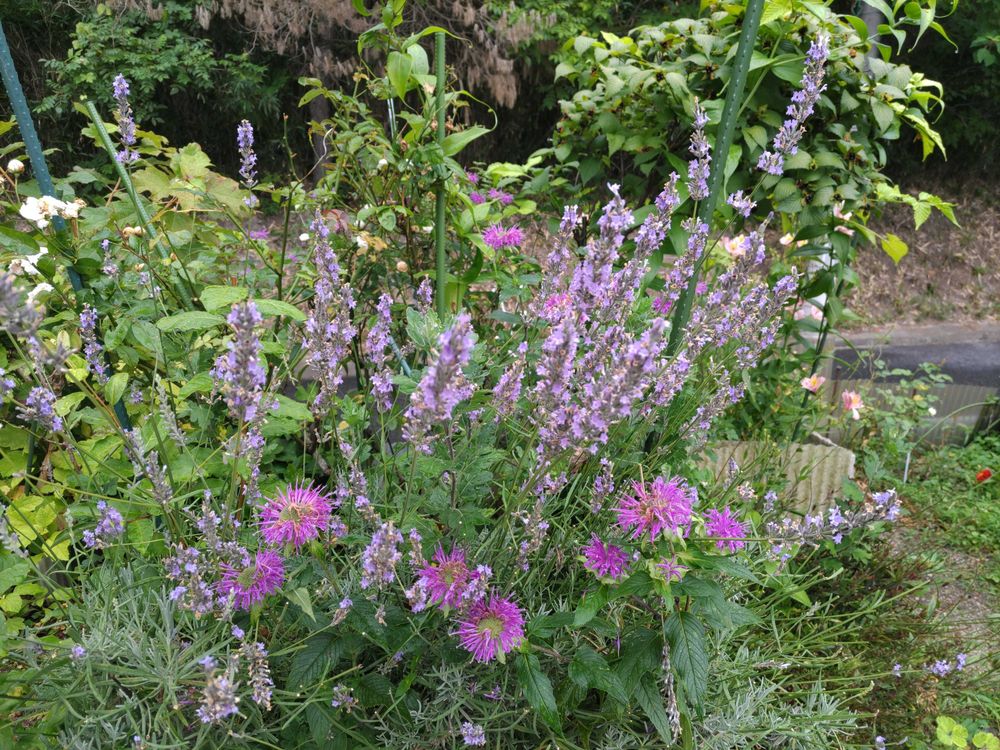 昨日のラベンダーと少し剥げてる赤紫のモナルダこの雨で