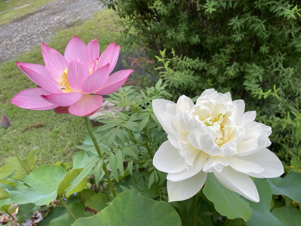 我が家のハス🪷紅白でめでたく咲きました😊 が、、気付いたら何者かに花芽が折られていました…道沿いに置いているので通りすがりの野郎にやられた様です😤…後で防犯カメラをチェックしようと思います。