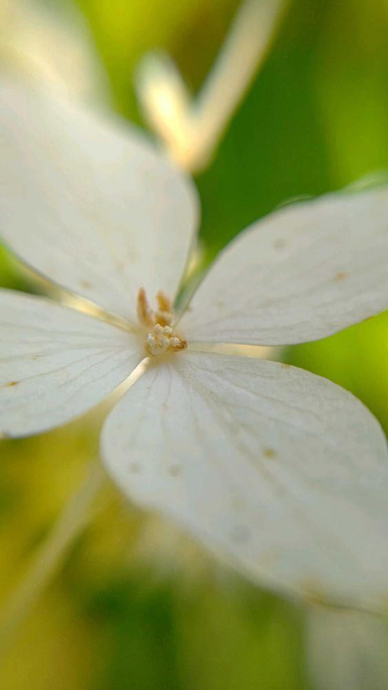 花弁状に変化した大きな4枚のガク片の中央には雄しべが見えるが、無性なので装飾花、中性花と言われる(2枚目)