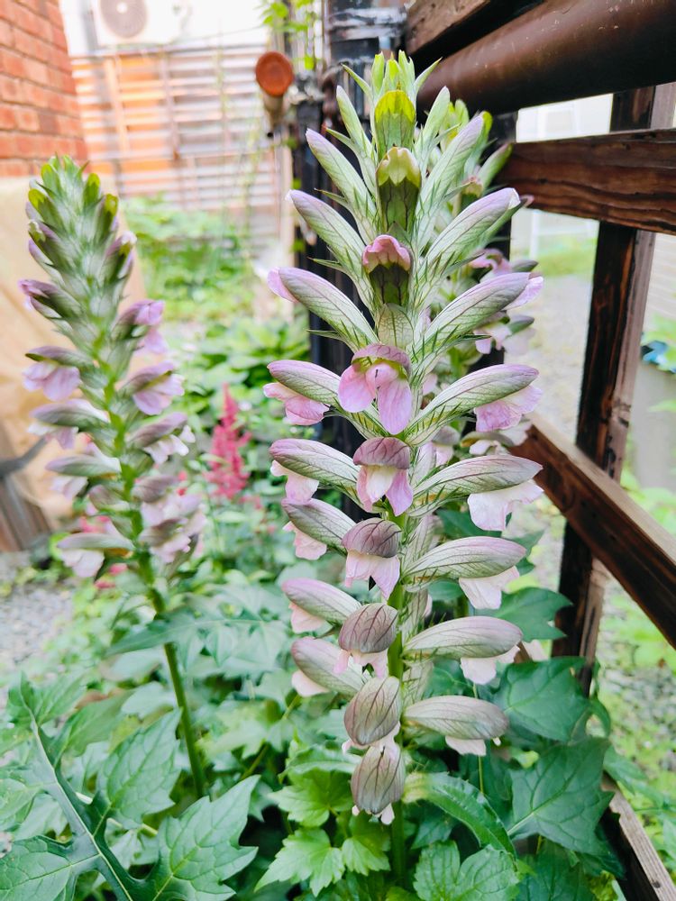 シェードガーデンの主役アカンサスも開花 日当たりの良いところでは葉っぱばかり大きくなってまったく開花しなかったんですが日陰に移すと毎年咲くようになりました