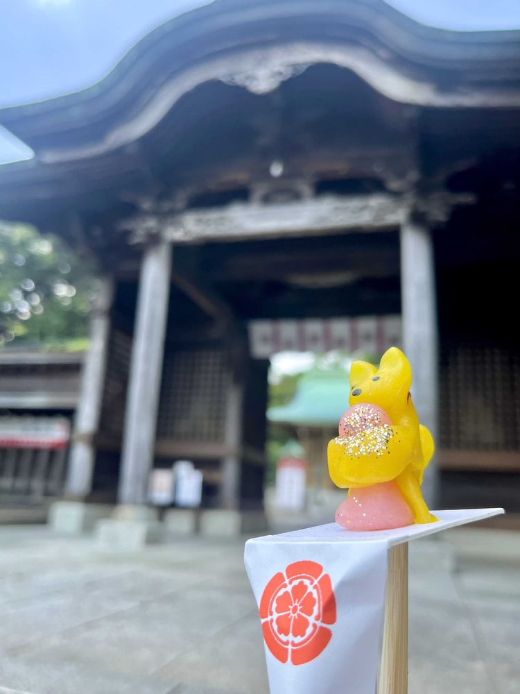 米粉でできたひょうたんを抱えた犬