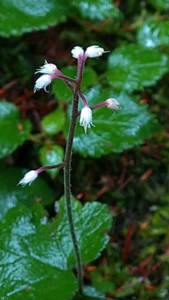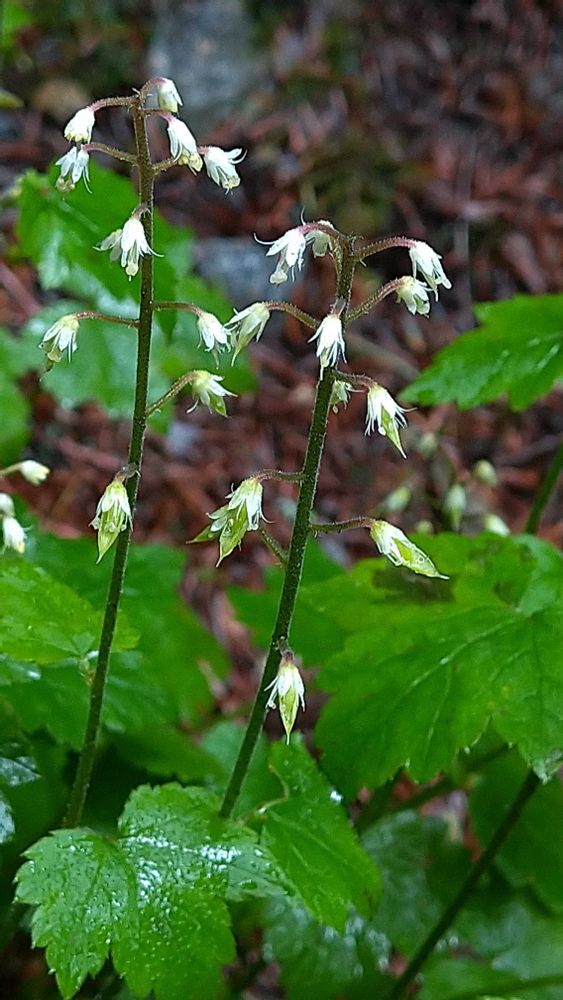 湿った林内に小さな白花が群生しています。