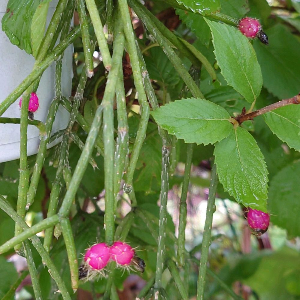 リプサリス〜我が家では、冬越しだけは家の中の窓辺に吊るして、後は、外のオオデマリの木に吊るして、バシャバシャと水やりもしてます〜ある日、実らしきが出来ててビックリでした〜yuriちゃんは何時も綺麗にモリモリ咲かしてるので、絶対に実をつけてると思ってました〜💕