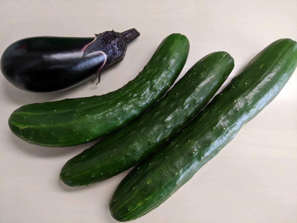 梅雨の中休みに収穫しました。キュウリは収穫遅れで巨大化しました。