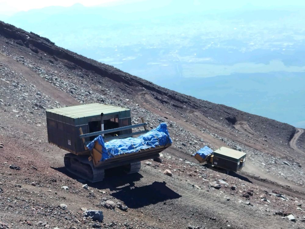 このブルドーザーが5合目から食料や物資を各山小屋に運び、下男時に山小屋で出たゴミ、遭難者や救護人を下ろします
