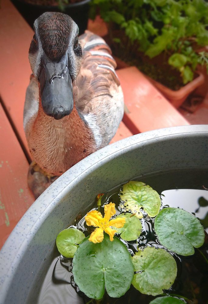 珍しい1日花アサザを見せて頂きありがとうございます😆💕✨水辺のお花で涼しさを感じますね。水槽のとなりの鴨は本物に見えます。