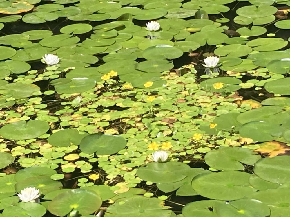 スイレンと一緒にアサザが咲いていました。望遠でないのが残念ですが、花冠は5裂し縁が細かく裂けていた♡