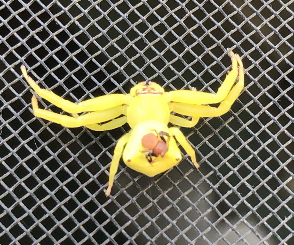 はい、大きな黄色いクモがメスでそのお腹に乗ってる小さな黒っぽい(赤っぽい)クモがオスだと思われます✨