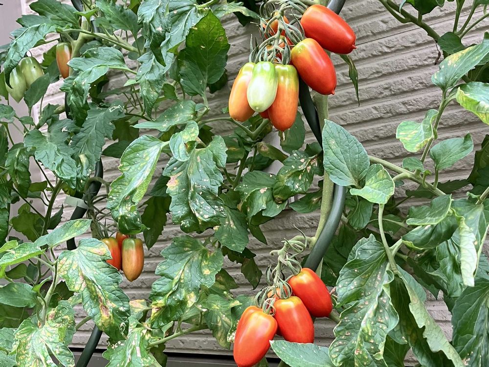 7/14 収穫、猛暑に耐えていた🍅 梅雨空☔️に戻り、トマト本来の生育温度20〜30℃になった途端赤く実り始めました