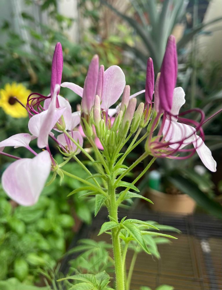 先日上から撮った写真で調べたら候補がたくさんあったけど、蕾が開いてきたので改めて横からの写真で調べたら、やっぱりクレオメだった☺️とっても可愛い💕