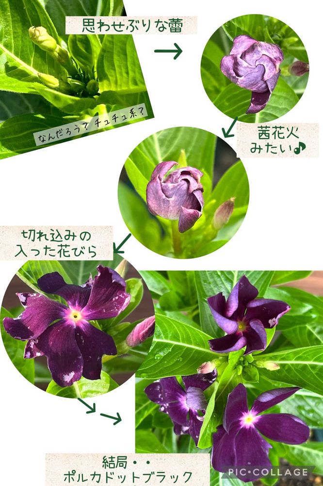 ② チュチュみたいな蕾→茜花火みたいに切れ込みの入った花びら→これはパープルの茜花火⁉️と期待しましたが、次からは普通のポルカドットブラックでした😫