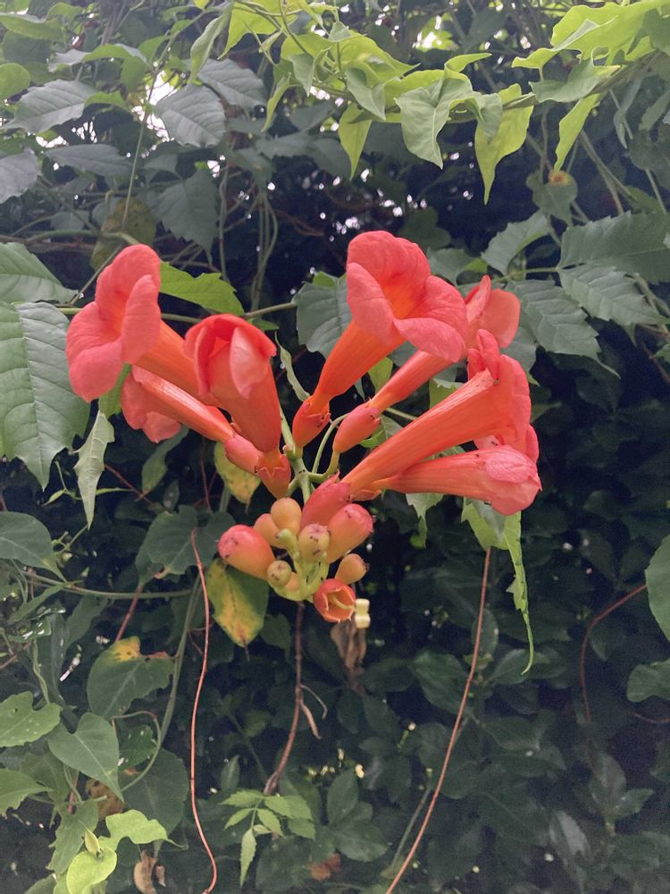 今朝見つけましたが、アメリカノウゼンカズラのようです。花がひとまとまりになり、上を向いて咲き、萼がオレンジ色で切れ込みが浅く短いです。花は小さく花筒は長いです。毒あり。