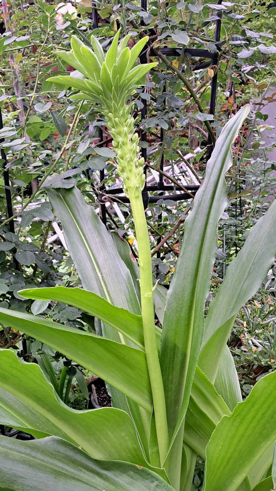 今 庭の中央で大きな葉を広げたパイナップルリリー ビッグボーイが 花芽を上げてきました