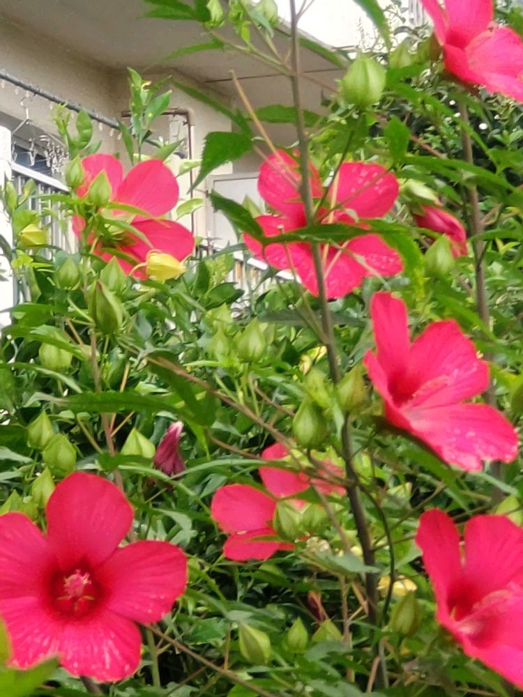 紅蜀葵 です毎日沢山咲いて元気づけられます 白も咲いてます
