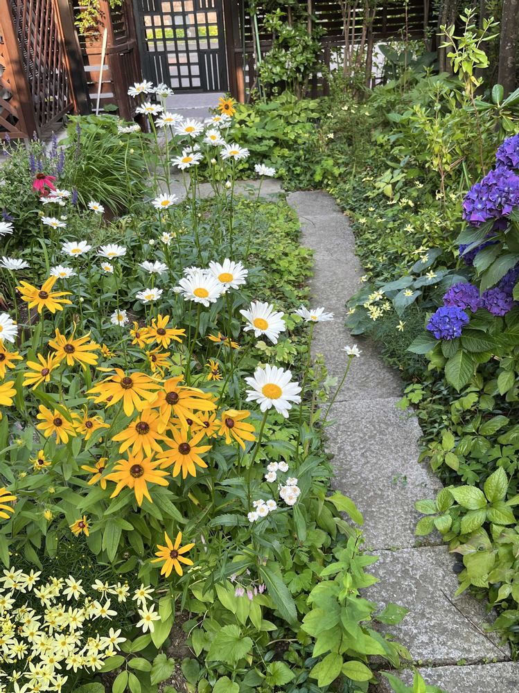 この小道は30年前庭を造る時私の希望で最初に2人で造ったんですよ その時は枕木だったと思います 今は腐らない石になってます🙋♀️毎日この道を歩きながら世話をしてまーす🥰🎵🎵