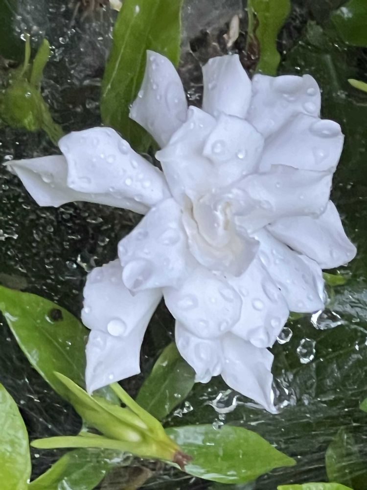 ⑤玄関前の八重梔子に張った蜘蛛の巣に雨粒