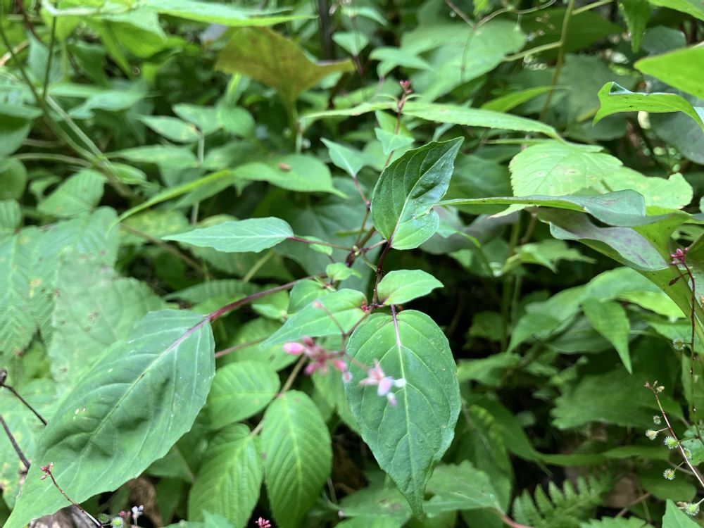 高さは20 センチくらい。葉は対生。卵形。赤い茎の頂に淡い紅色の小さな花をつけていました。