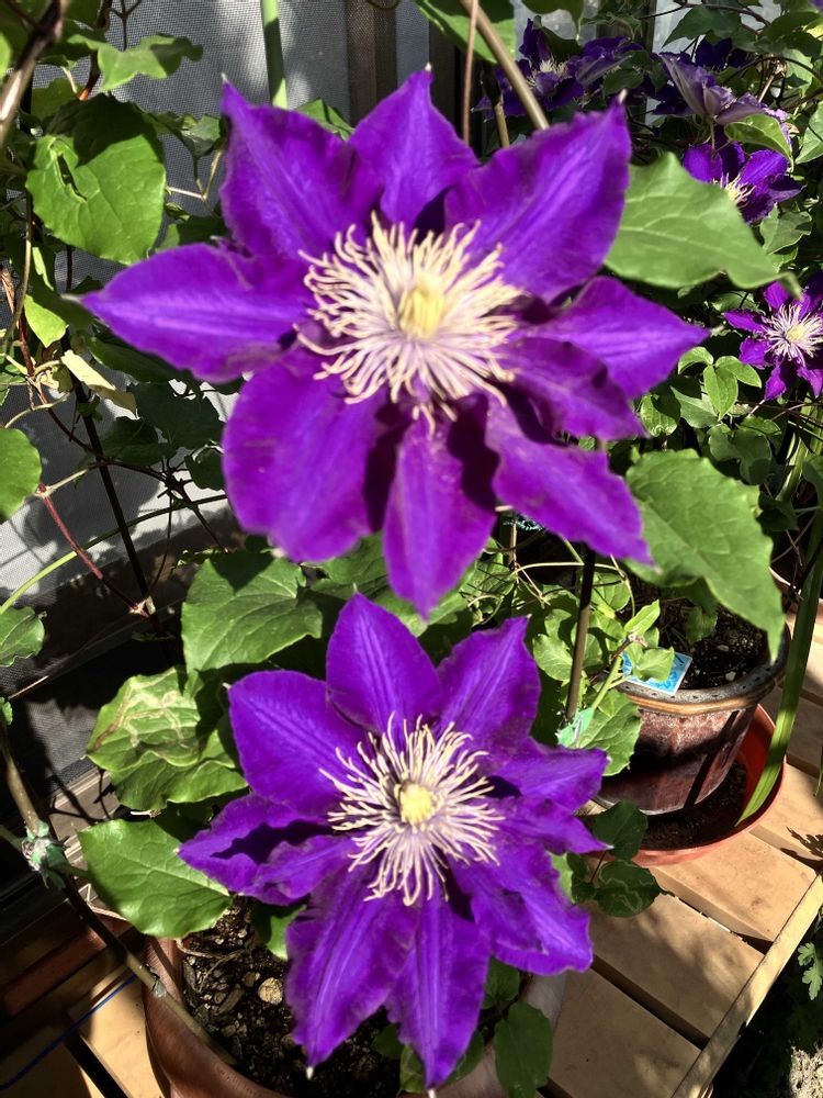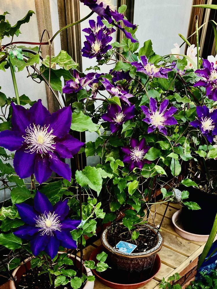 カラフルなクレマチスさん元気をもらえます💜「ひとり居の朝やうち向ふ鉄線花」(水原秋櫻子)水分補給を忘