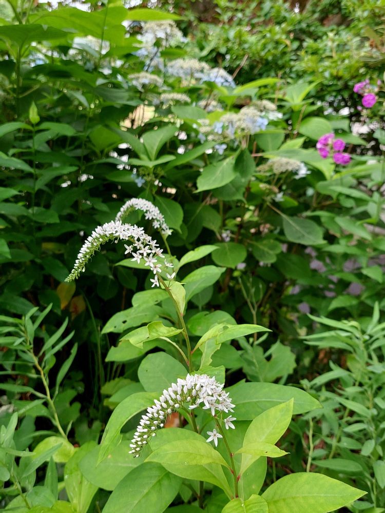 百日草と、前庭に顔を出したオカトラノオ(鳥さんかな)