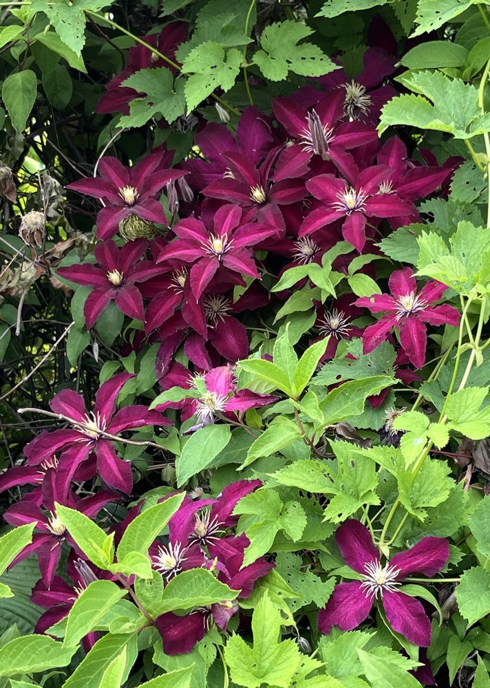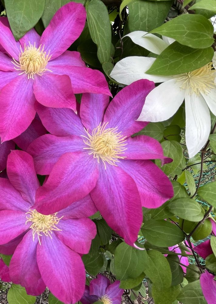 カラフルなクレマチスさん元気をもらえます💜「ひとり居の朝やうち向ふ鉄線花」(水原秋櫻子)水分補給を忘れずに🤗💦🤗