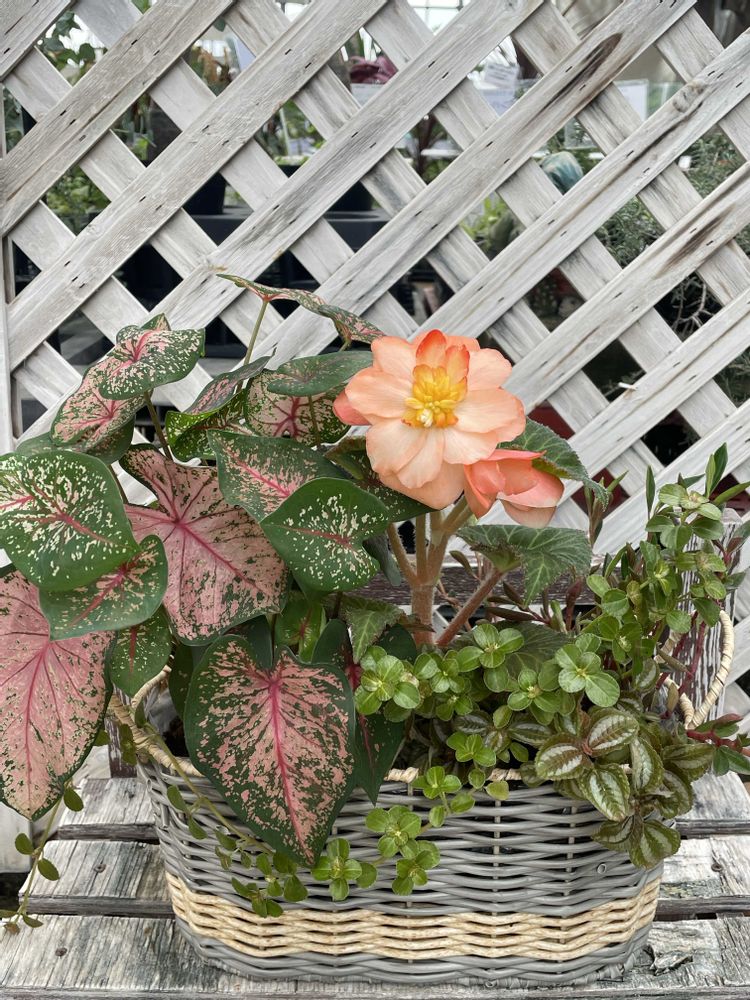 カラジウムを始め素敵な観葉植物の寄せ植えですね