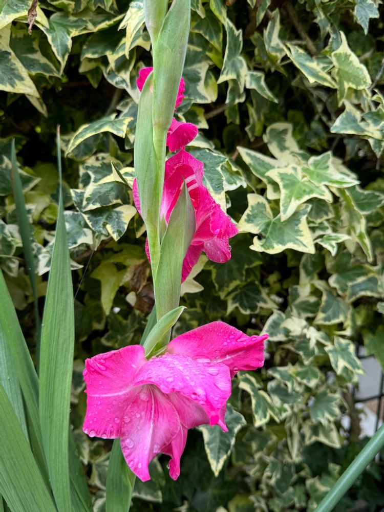 グラジオラスの濃いピンクが鮮やかです。雨に濡れると、尚、美しい