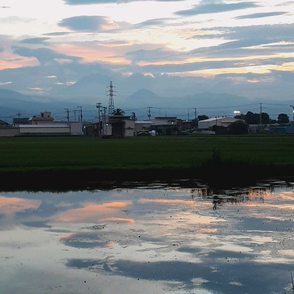 この☂️の日の翌日の休耕田に映った🌆、なんとも言えない美しさにうっとりしました🍀