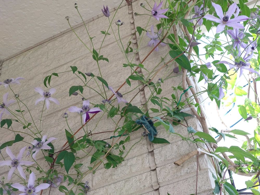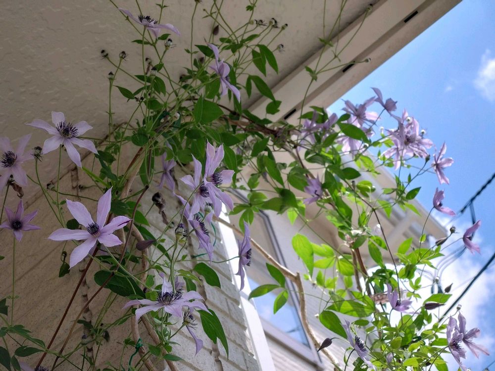 カラフルなクレマチスさん元気をもらえます💜「ひとり居の朝やうち向ふ鉄線花」(水原秋櫻子)水分補給を忘れずに🤗💦🤗