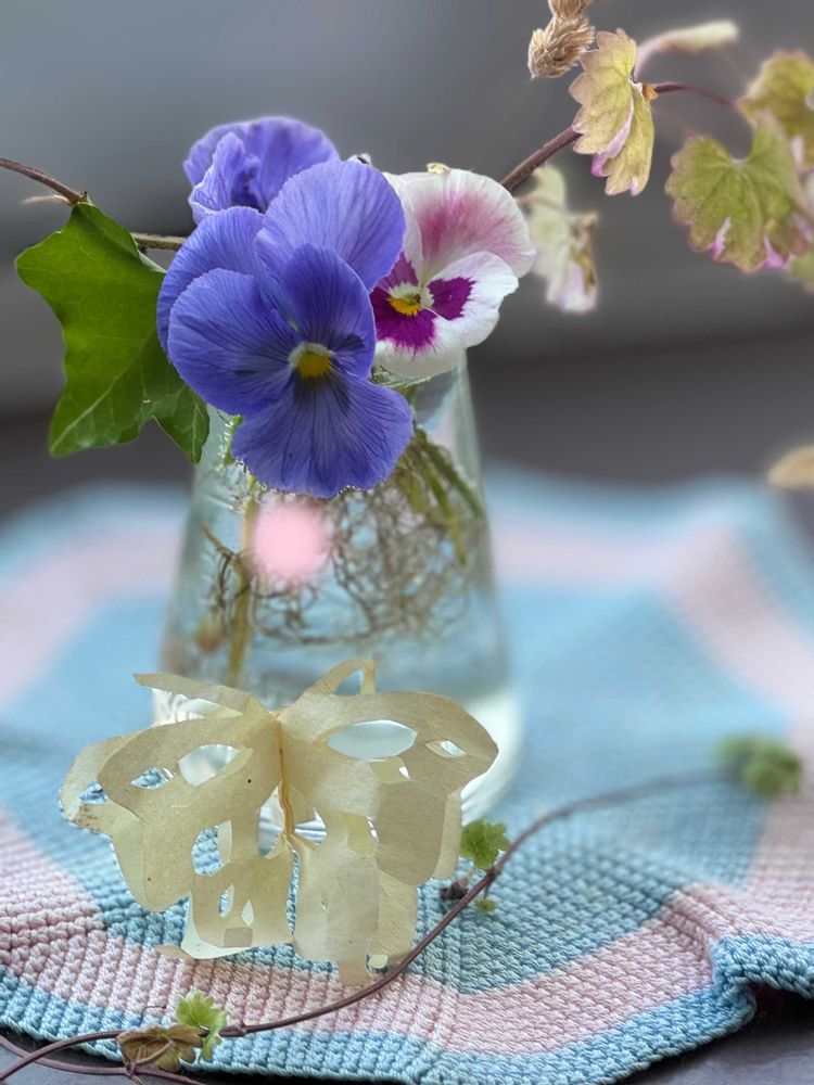 敷物が、花瓶にさしたパンジーの華やぎを、より魅力的に、そして涼しげな雰囲気にして、より一層爽やかな想いを届けてくれる