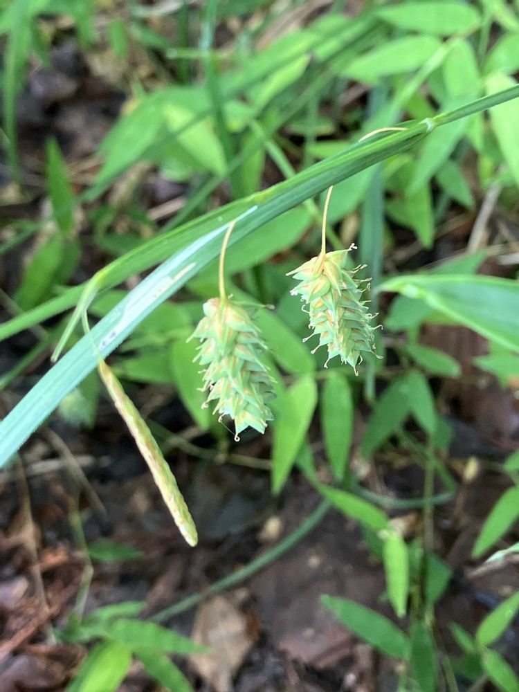 先日花友さんの投稿で覚えたゴウソ(郷麻)を見つけました。初めましてです。別名がタイツリスゲだそうです。釣り糸🎣を垂れてる感じ伝わりますか?地味可愛い野草でした。茎の天辺にぶら下がってる細いのが雄花穂で、その下に2個あるのが雌花穂です。全国の田んぼの畦や湿地で見られるそうです。7/13栃木県