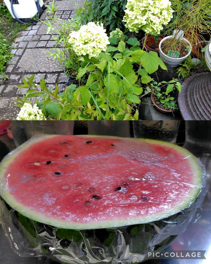 ②白かったアナベルが緑になっています 兄が大きなスイカ食べきれないと半分持ってきてくれました🎵