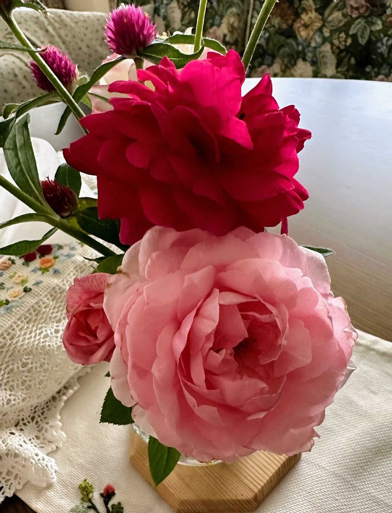 庭パトしてたら、挿木苗のERテスオブザダーバビル(赤)と、新苗のセントセシリア(ピンク)が咲いていました