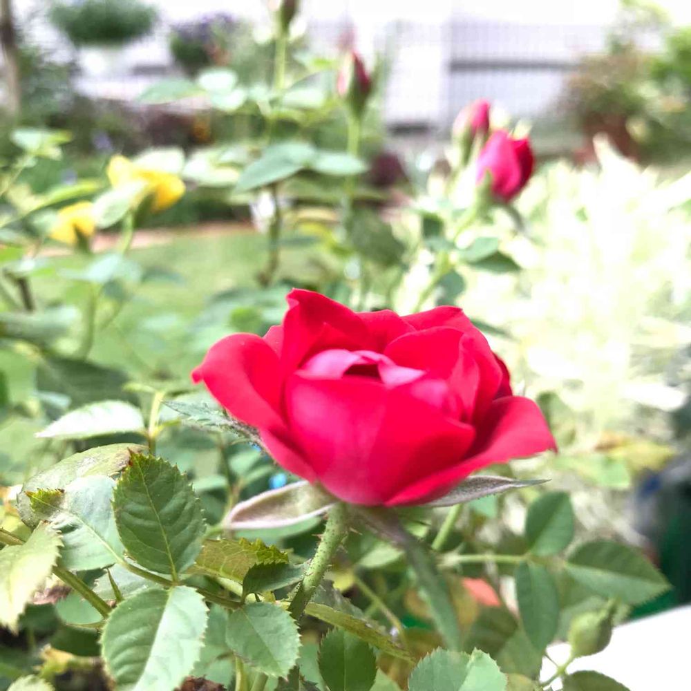 赤と黄色が寄せ植えになっているミニ薔薇、赤が急にやる気を出して蕾がたくさんついています