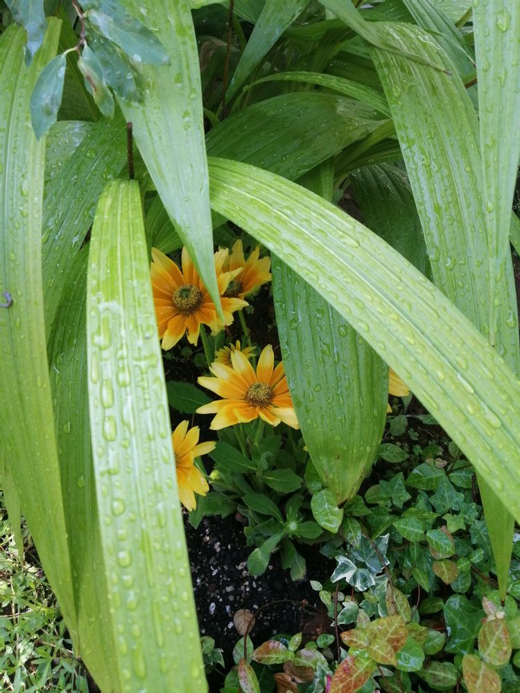 紫蘭の葉に埋れてるルドベキア プレーリーサン😂