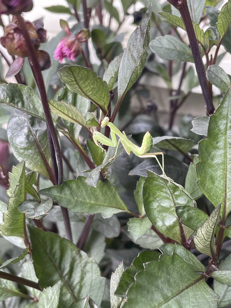 ギボウシの花茎を切っていたら、カマキリの子供が出てきました😊