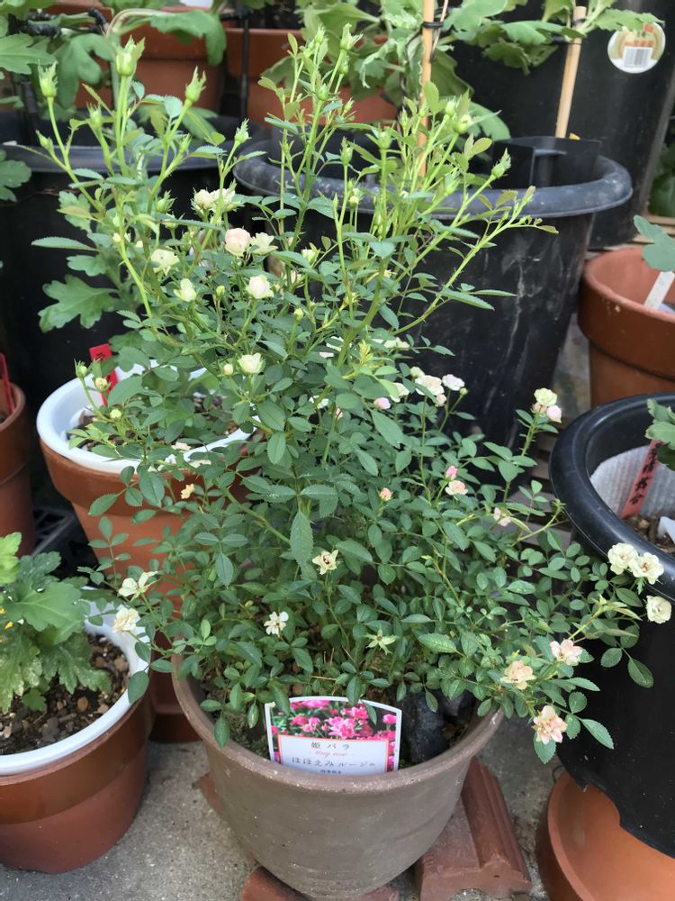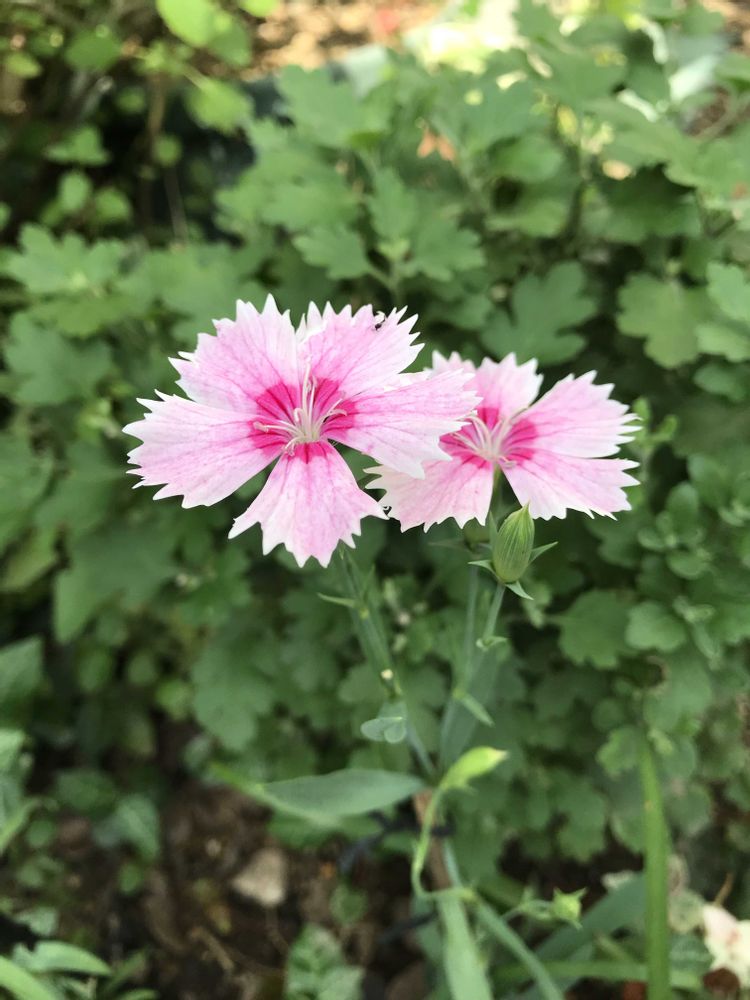 2枚目は種蒔きからのナデシコ。姫バラはよく茂ってきましたが、暑すぎて花は白っぽく、下葉が黄色くなりがちです。花柄は早めに切って、変色した葉は切っておきました。薬も散布して大切に育てています。